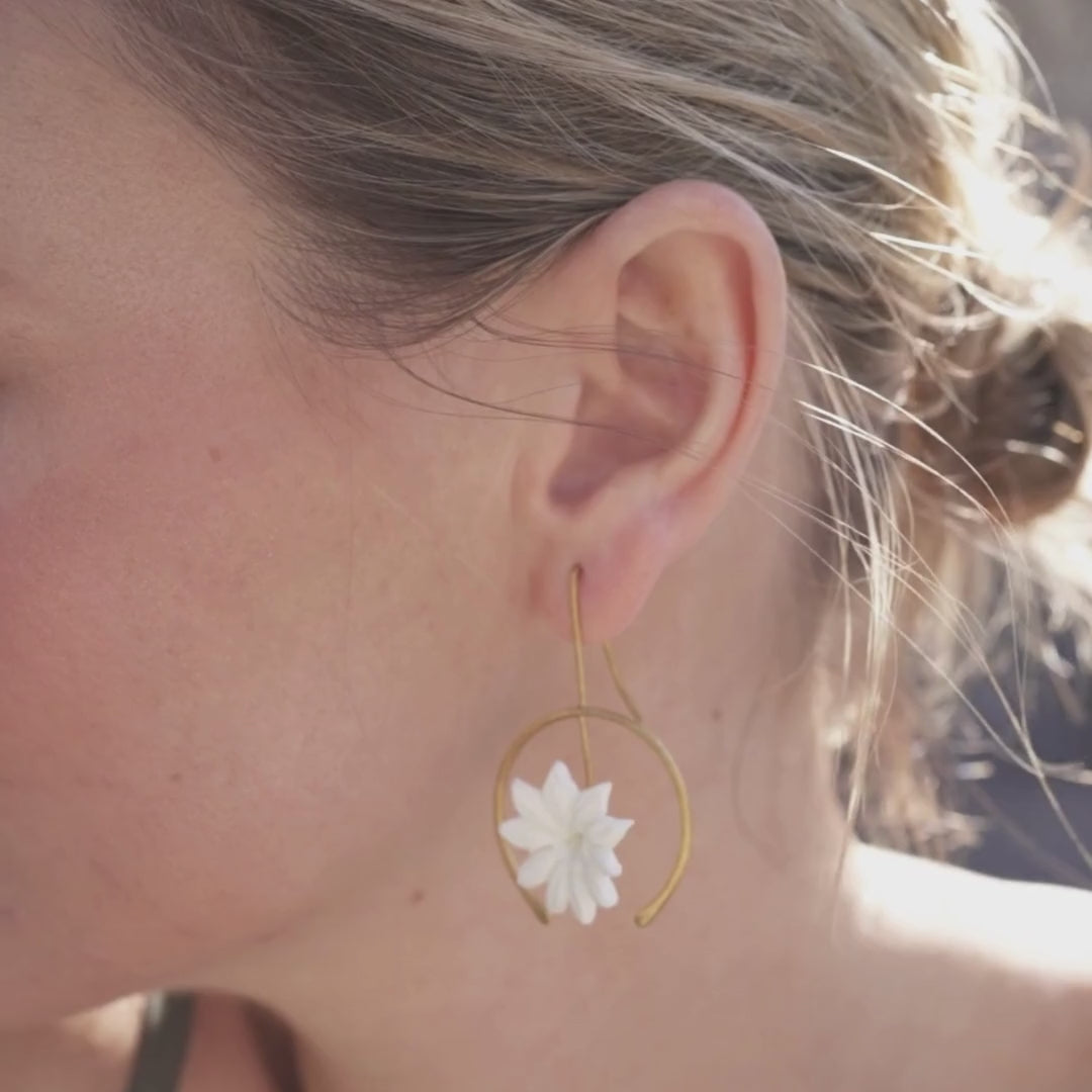 Earrings made of 24-carat yellow gold-plated brass with a hand-modeled cold porcelain flower.