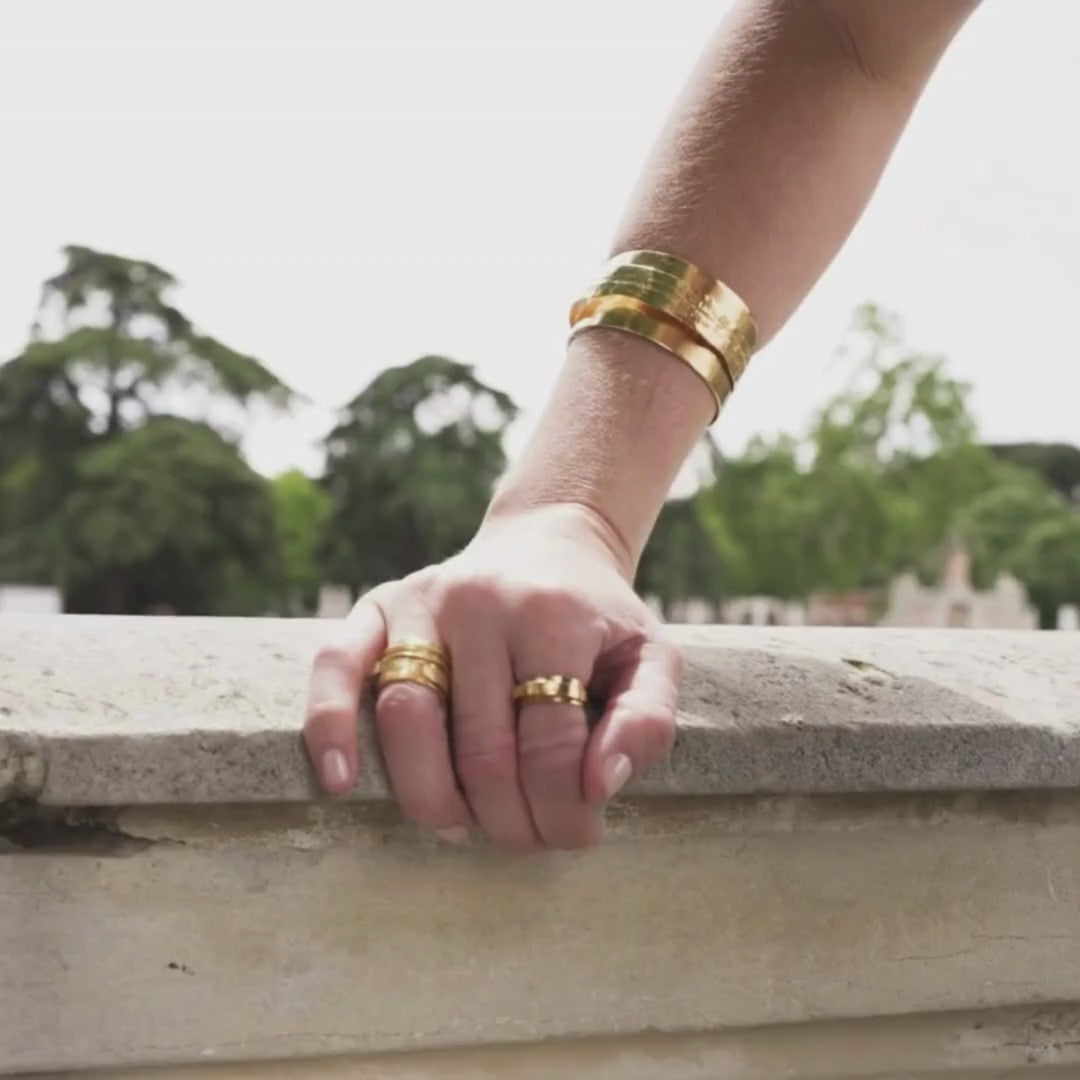 Bracelet made of 24-carat yellow gold plated brass. Its adjustable size allows you to adapt it to your wrist. Coordinate it with the earth earrings and the double and earth rings.